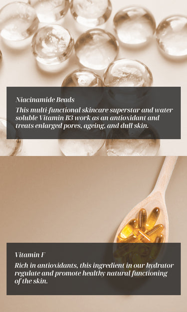 3 in 1 Skin Hydrator, a water-based hybrid hydrator enriched with 4 (four) essential serums: Niacinamide, Hyaluronic Acid, Alpha Arbutin and Vitamin C. Together, they work harmoniously to diminish pigmentation, regulate oil production, deeply hydrate, illuminate your complexion, and combat free radicals. But that's not all – the formulation also features Vitamin F, derived from botanical extracts, that boost collagen production and combat ageing. Unique to the Indian market, it boasts 1.4% pure ceramides (25X higher than standard) for fortified skin barriers. D-Panthenol to lock in moisture and calm active acne. And a blend of Lavender, Camellia, and Patchouli Oils for a soothing and antibacterial effect.